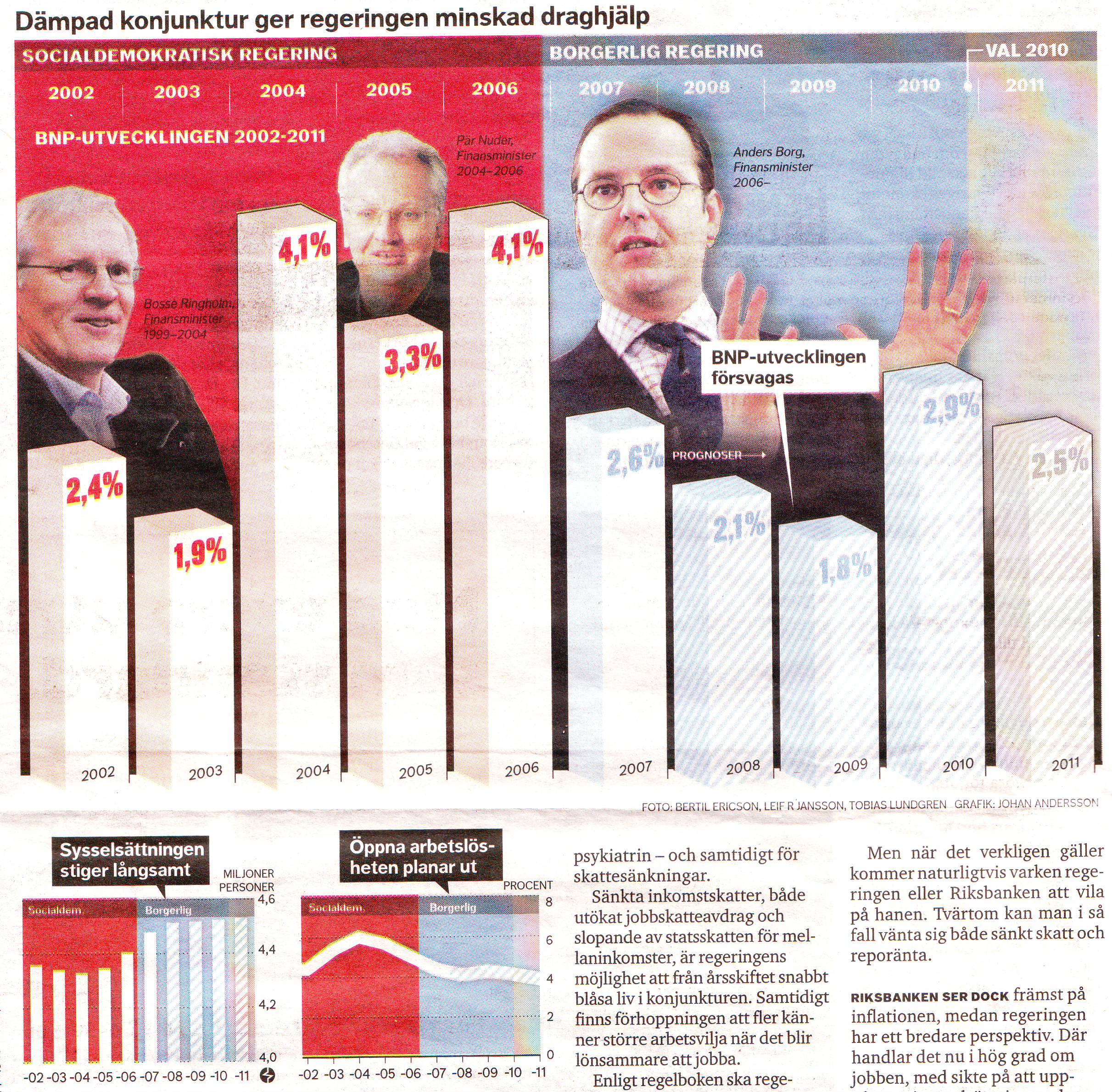 アメリカ経済の不安定化がスウェーデンにも影響が及ぼす懸念が強くなり先の経済成長の下方修正がされている。 スウェーデンの近年の経済成長(GNP)は2-4%と欧州でも安定している。(2002年からのGNP, 失業率[減少傾向]、求人率[増加傾向]を参照 DN