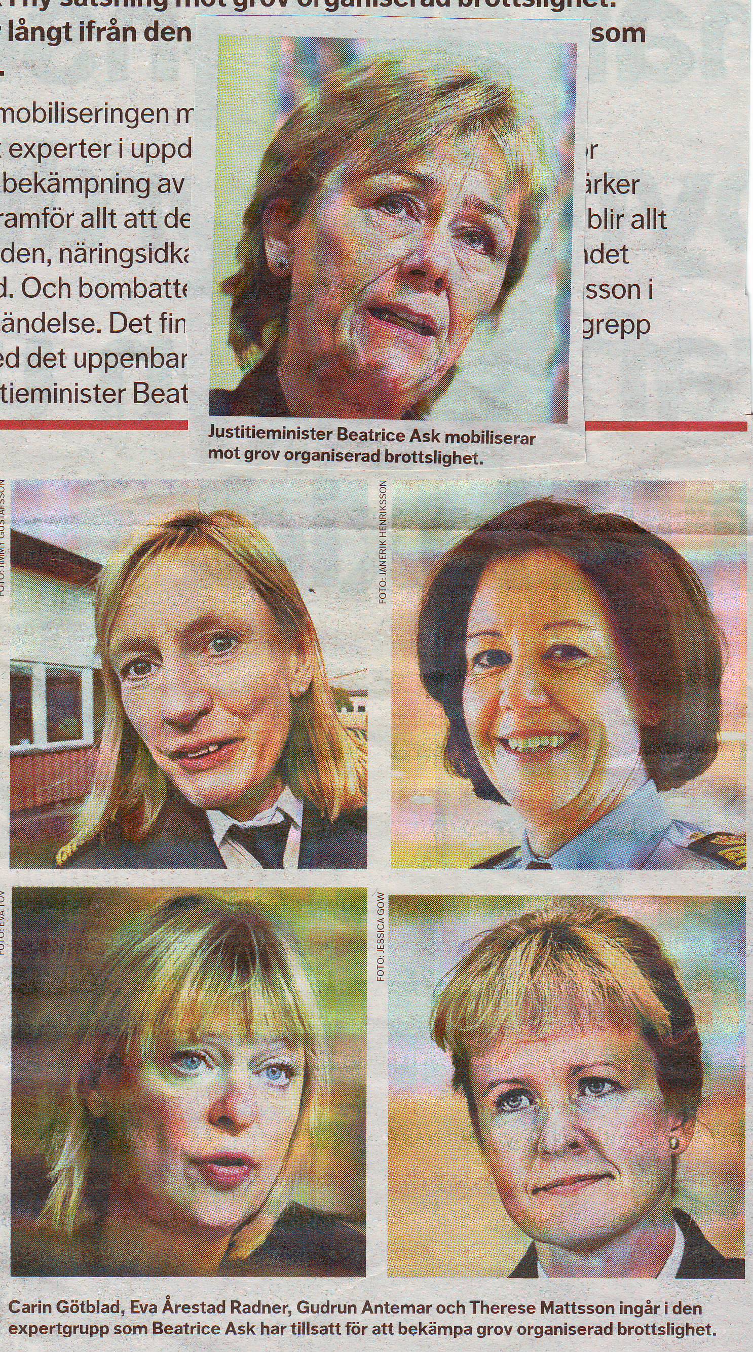 スウェーデン女性の社会的地位を示すシンボル的な写真が日刊新聞Dagens Nyheterの第一面にでた。 南スウェーデンの犯罪グループ(と言っても移民中心の僅か数十人組織の麻薬、タカリ等を同じ移民者のレストランを中心にやっている)が、裁判中の女性検査官の自宅のドアにピストル銃撃をした事件が発端で、事の重大性を感じ取った女性法務大臣Beatrice Askは他の同様なグループを徹底的に調べる為に全国犯罪警察(警視庁)、県警察、安全(秘密)警察、国際検察、経済犯罪局からの6名の最高責任者を代表とする調査会を結成した。その6名の責任者の内4名が女性である。大臣も入れると7名中5名が女性である。