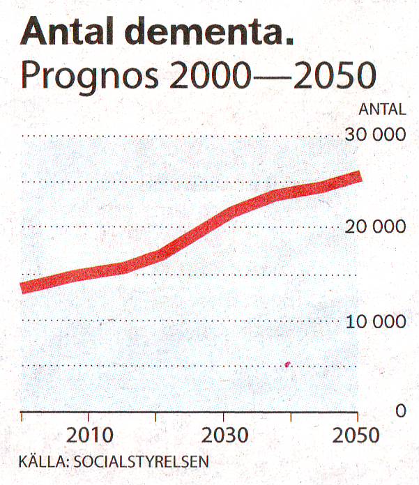 社会庁(Socialstyrelsen )の調査によると認知症患者数は年々、その数を増しており、2005年の142200人から、この先、今の条件(現状の投薬、治療処置)で行くと2050には約250000人までになると警告を出している。この大きな原因は年々寿命が延びていることによる。 現在、家庭で介護を受けているのは軽、中症を中心として約8万人の認知症の老人がおり、この人たちは平均1時間(一日)の介護サービスを受けている。その多くが、配偶者など家族の人たちによって介護がされていて、その平均介護時間は6時間と言う数字も出ている。最近は重症者の家庭介護が著しく増え続けているのに公共の介護サービスはわずか0.5時間ほどしか増えていない。 重症者の家族の介護時間は週16時間にもなり、特に配偶者の負担がおおく増している。社会庁報告では配偶者の負担は、もう既に限界を超えていると指摘している。費用も増加しているが認知症者の増加率にはついて行けない状態が続いている。今後は、さらに介護施設の早急な建築増加の必要性を強く指摘している。
