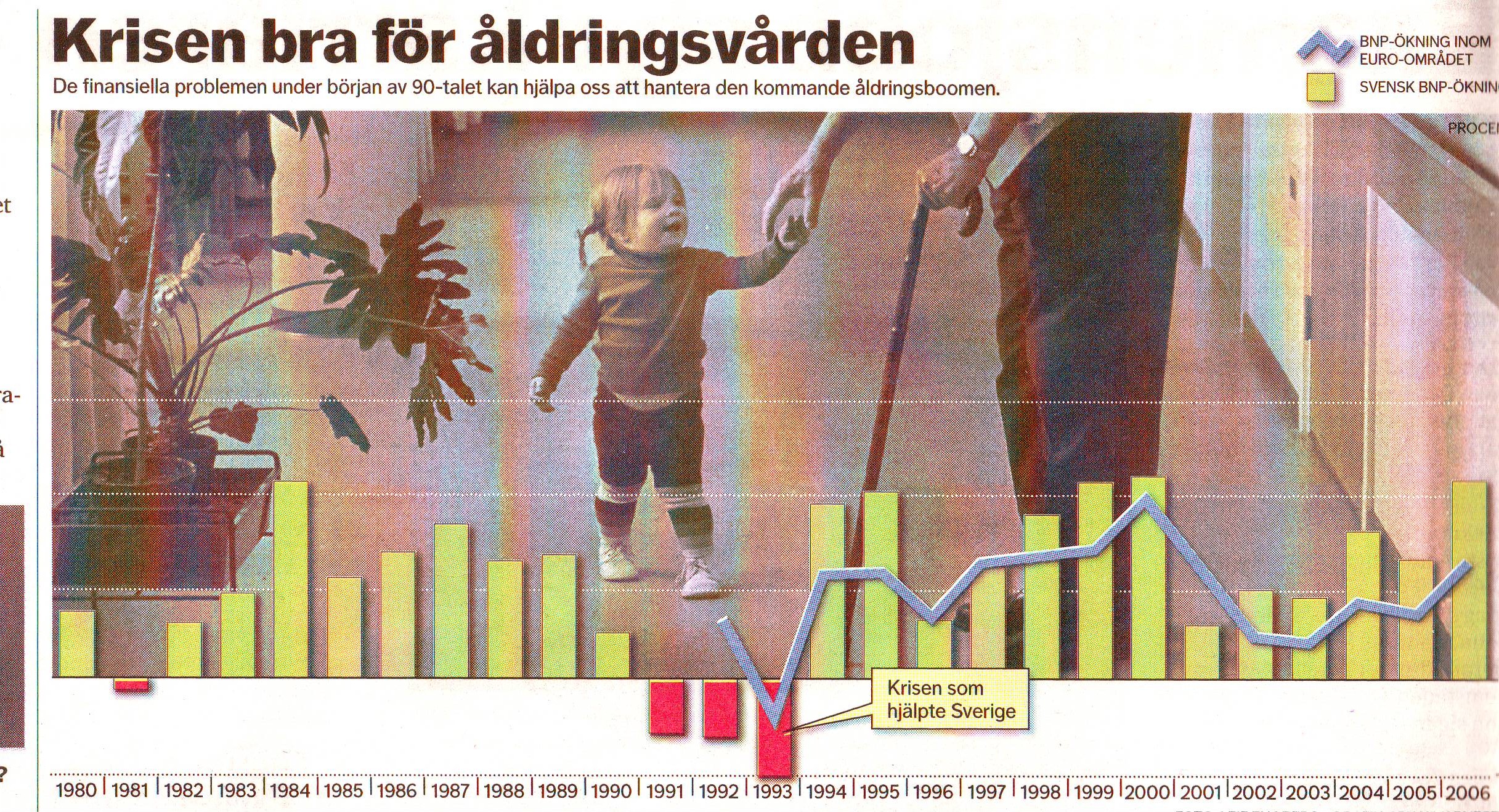 OCEDの最近の経済成長に関する統計によるとスウェーデンは経済成長が最も安定している国の一つであると報告されている。 その報告をまとめると: スウェーデンは貿易依存度化が最も高い国の一つであるために1990年代前期に起きた国際的経済危機を契機に経済は最悪状態に陥った。この不況期間に深刻化した失業や福祉対策に幾つかの税の改正(付加価値税、雇用主料金(AGA)所得税のアップ等)や福祉面での引き締め策がとられた。同時に公共部門での合理化が余儀なくされ、予算の大きな削減に福祉分野ばかりでなく教育、文化、軍隊での質の低下も指摘された。使いすぎの福祉に強い批判が出て、外国からもスウェーデン型福祉モデルが疑問視されたのもこの頃である。 結果的には与えられた条件の中で高い質を維持する努力がなされたと、多くのところから高く評価されているのが一般的です。その後、スウェーデンの経済は上向きに転向して、現在はOECD諸国でも優等生の一国としての位置を維持しています。これも1900年代前期からの危機を教訓としていち早く対策を打った証しとも言えます。スウェーデンの福祉政策は党派を超えたイデオロギーであり、揺るがざるものであるとも言えます。
