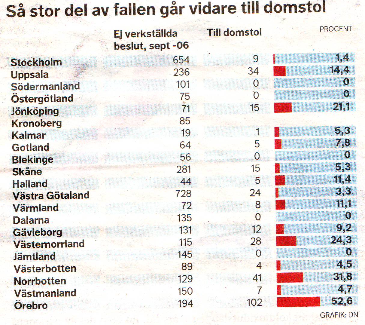 看護、介護サービスの実行する期日が自治体(担当者)と当事者との間に約束されたが、それが延滞された場合には、国はその自治体に違約金を国に支払うことを課することができる法が昨年の9月1日から施行されている。例えば老人介護、児童保護、障害者ケアが適用分野にあたります。違約金は一件あたり10万–1百万クローナ(160万-1,600万円)。この法が施行されてから、すでに3500ケースのクレームが報告されている。地域(県)によってクレーム申請の数に大きな差が出てきています、これは、クレームの判定に戸惑いがあり、一律化した基準がまだ確立されていない為と思われます。基準が整うと法廷判定に委ねるというクレーム数は減少すると思われます。県別のグラフを参照ください。左側の数字はクレーム数、真中の小さい数字が法廷判定に行った数で、グラフがその率です. ほとんどのケースは訴えが生じてから裁判にゆく前に対処されていますが、その数は地域によってまちまちです。現実的に法廷で違約金の支払いを命じられた自治体は具体的な基準レベルの程度を知ることができ、同じようなケースは次から避ける様になり裁判沙汰が減少することになると思われます。(helena.gunnarsson dn)