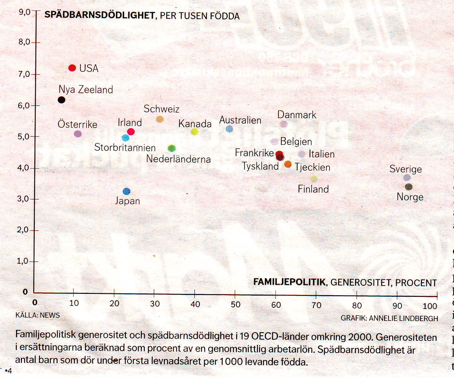 UN(WHO-CSDH)がスウェーデンの研究グループCHESSに委託したプロジェクト“福祉政策の健康効果”というテーマの調査の結果が出た. 寛容な家族政策のレベルの測定には公共/職場などから提供されている全てのサポート(妊娠、出産、育児、健康、保育、職業、経済、ETC)を数値化して乳児の死亡率との相互関係をOECD19ヵ国間の比較で出したものです。(2000年ベース)