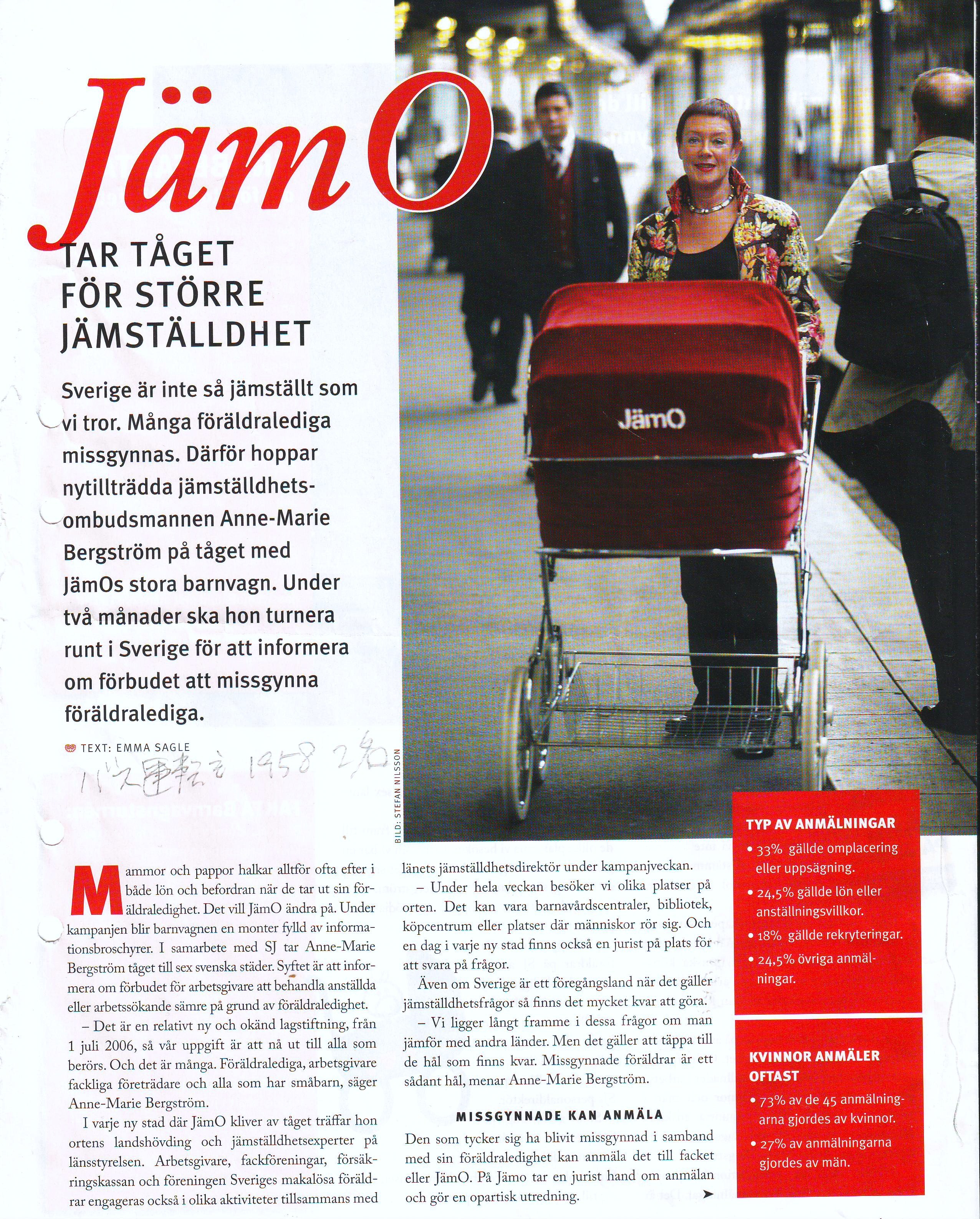 新任オンブツマン(Jamo)Anne-Marie Bergstromが男女均等の広報活動の為に2か月の全国ツワーをスタートした。大きな目的は親保険の育児休暇とることが原因で職場から不当扱いをされた場合の法の適用を全国の人たち(特に若い人達)に知ってもらう為めです。 彼女の広報活動スケジュールは報道関係ばかりではなく企業団体や労働組合にも知らされている。SJ(スウェーデン国鉄列車)の座席シートに配布されている列車マガジンにも記載されている。新任オムブツマンは双子用の乳母車に資料を山のように積んで列車で全国各地へ移動中という見出しです。